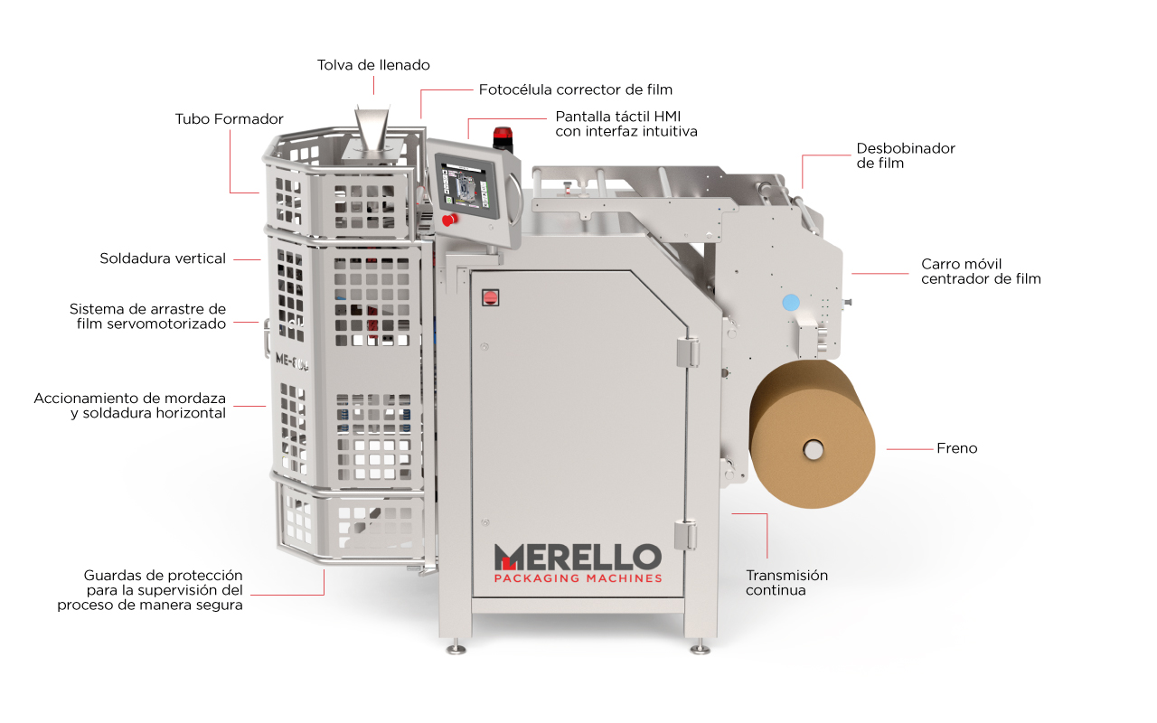 Su diseño robusto y la utilización de servomotores para el movimiento de la mordaza y el arrastre del film garantizan un funcionamiento preciso y continuo, minimizando las interrupciones y mejorando el rendimiento general del proceso de envasado.